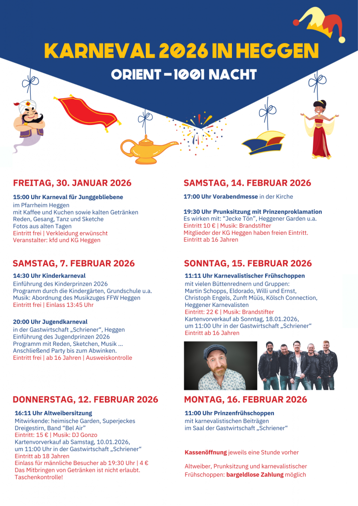 Die Karnevalsgesellschaft Heggen blickt auf eine mehr als 90-jährige Geschichte zurück, denn sie wurde im Jahr 1932 gegründet. Heute tragen eine Vielzahl an Gruppen, Garden und weiteren Mitgliedern dazu bei den karnevalistischen Frohsinn von Generation zu Generation weiterzugeben.